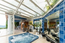 Une véranda abrite un espace bien-être avec sauna, jacuzzi et appareils de fitness. Enfin, une cuisine d'été entièrement équipée, avec barbecue au gaz et au charbon de bois.